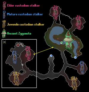 Ancient Zygomites and rod fishing spots can be found around the spring in the centre of the dungeon. With level 64 Agility, a stepping stone can be used to cross the water and quickly reach the elder custodian stalkers in the north.